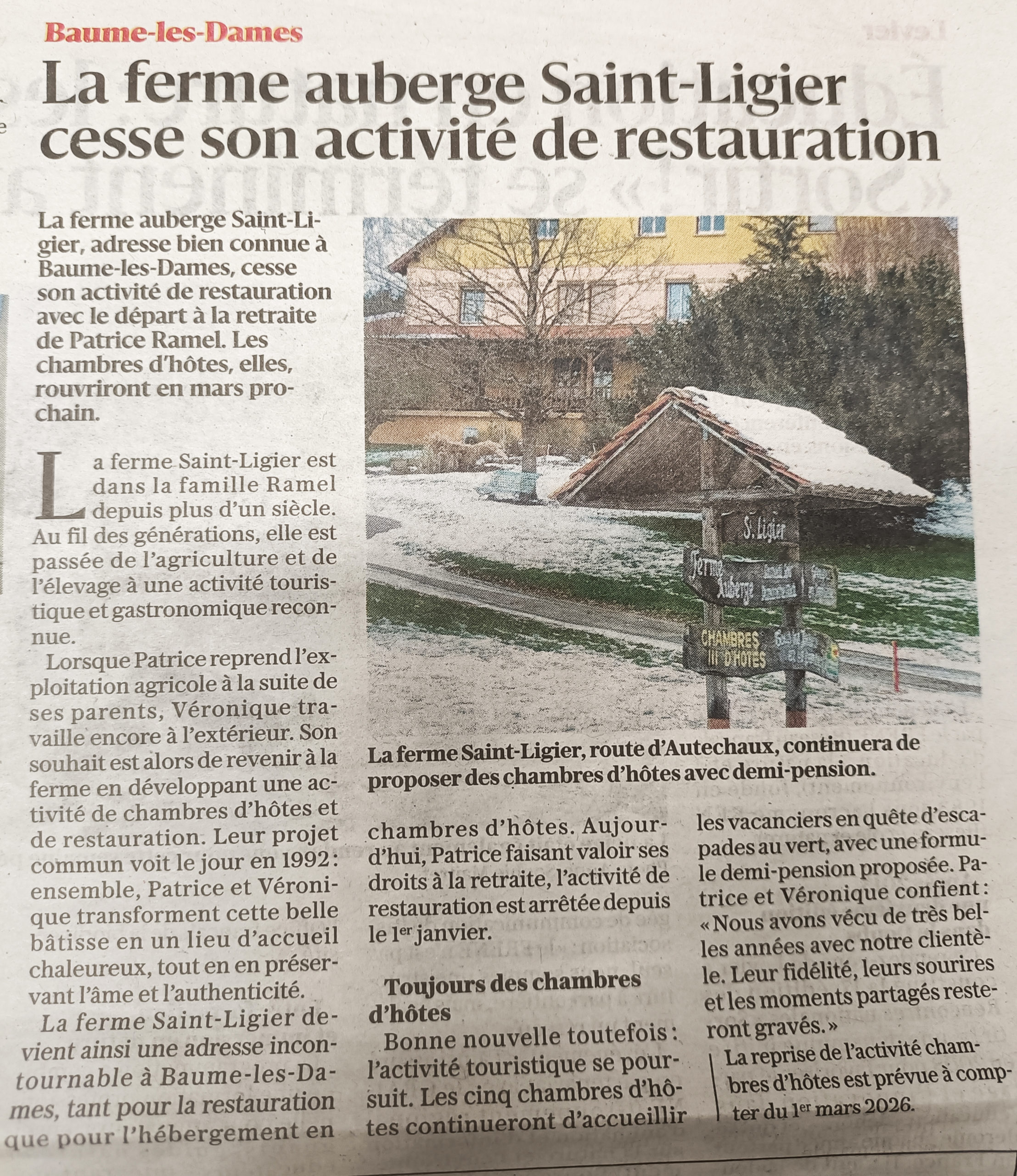 « Bel endroit familial, paisible où l’on se ressource naturellement. Excellente auberge authentique dans ses valeurs de bien manger, bien boire et bien dormir dans ce cadre agréable purement Franc-Comtois offert par Véronique et Patrice, avec gentillesse, sourir et bonne humeur. À la Ferme de Saint Ligier, à Baume les Dames, nous y reviendrons, c’est sûr. »